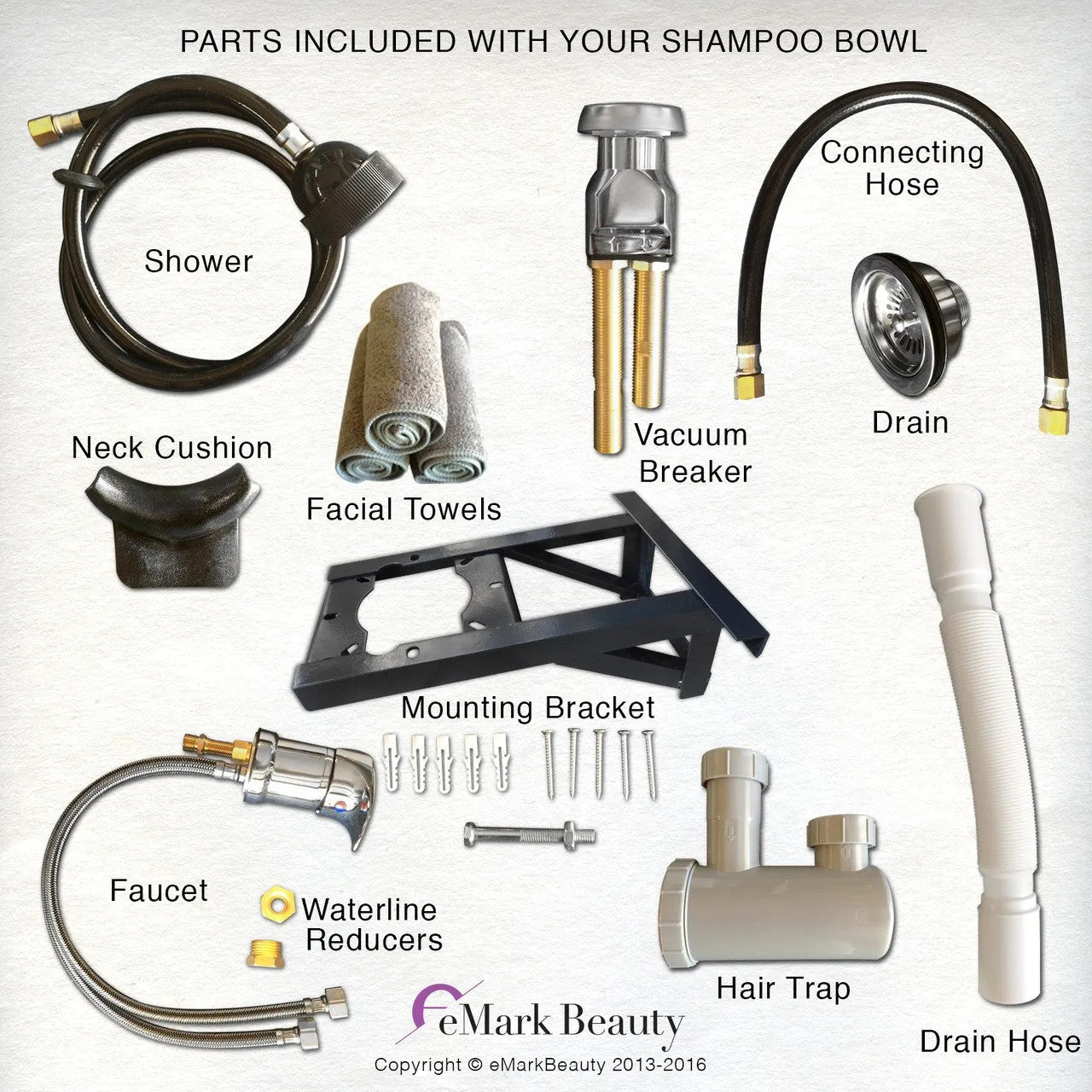 These components use U.S.A. standard hardware and are compliant with the Uniform Plumbing Code (UPC), American Society of Safety Engineers (ASSE), and Canadian Standards Assoc. (CSA). All parts fit most standard shampoo bowls and plumbing.