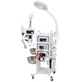• Set includes a high-frequency steamer with glass jar, microdermabrasion unit with vacuum, a 5X flexible magnifying lamp with a protective glass cover, extractor with diffuser, and a facial brush, all organized on a convenient 3-tier cart.